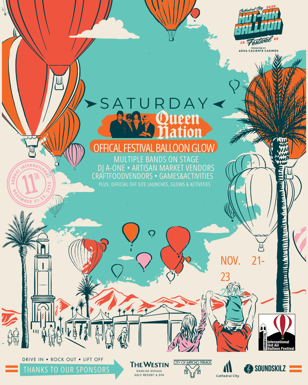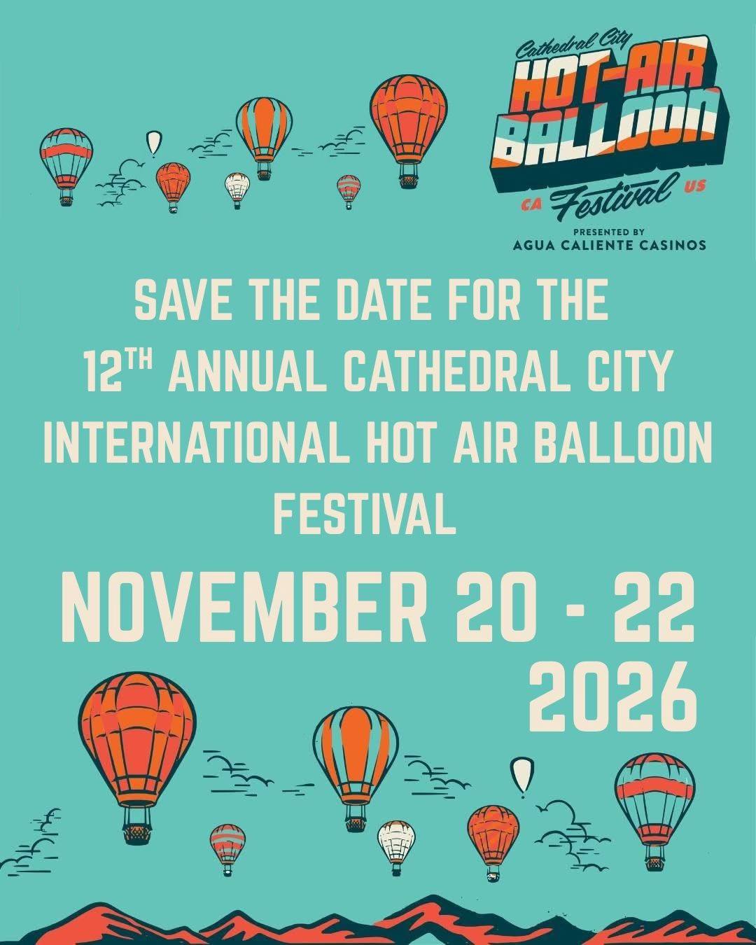 Tucked between Palm Springs and the scenic Coachella Valley, Cathedral City is a sun-drenched desert gem with vintage California charm. Palm-lined streets, colorful art, classic cars, and breathtaking mountain backdrops make it the perfect place to celebrate. Come for the balloons and music—stay for the endless desert skies and warm welcome.