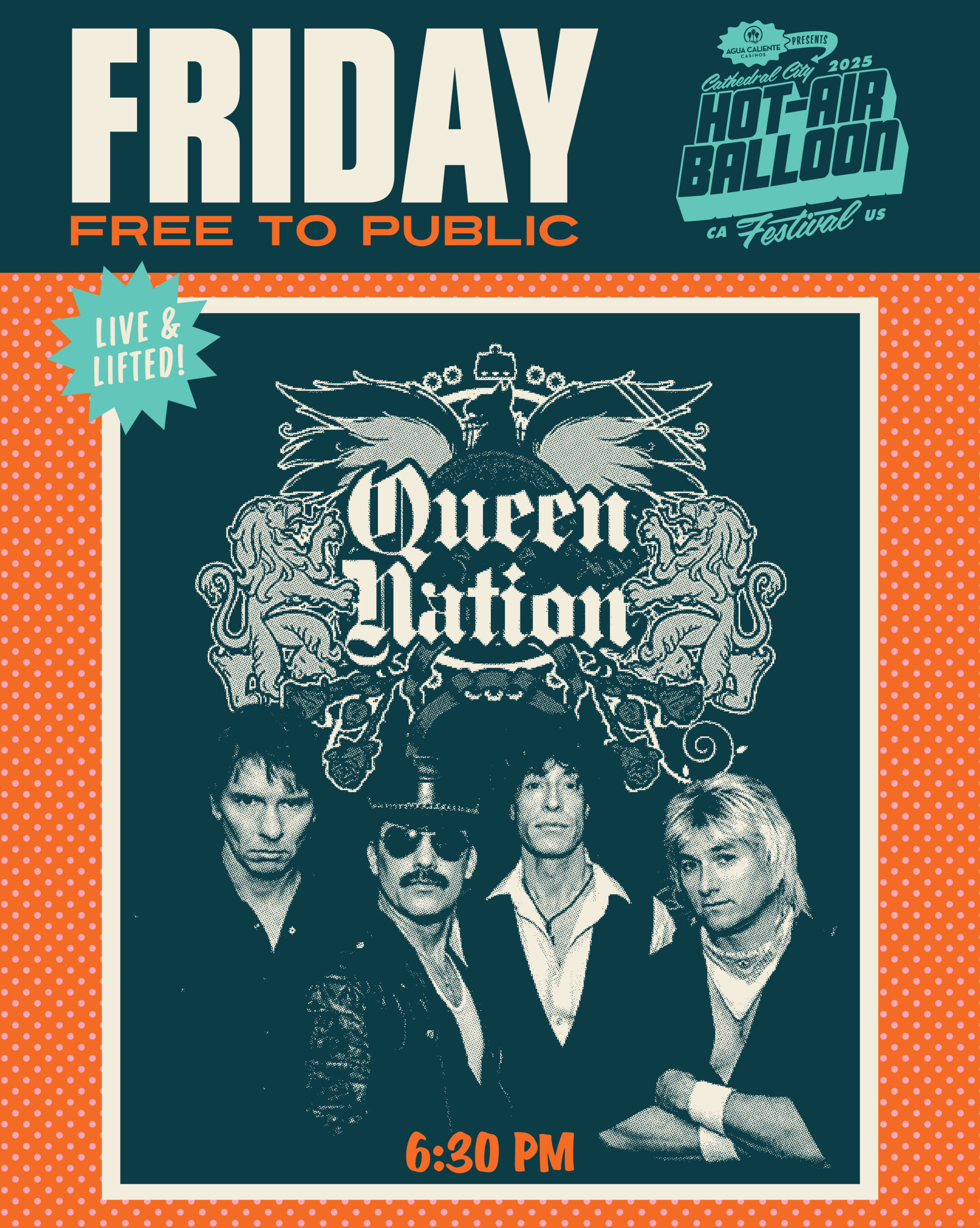 The festival weekend kicks off Friday evening with a free community celebration open to all. Doors open at 3:00 PM with vendors, food, and games, followed by live music on the amphitheater stage. Headliner Queen Nation—the nation’s top Queen tribute band—delivers a high-energy show packed with classic hits. As the sun sets, watch the balloons glow against the desert sky, then stay for the grand finale: a spectacular drone light show over Cathedral City.